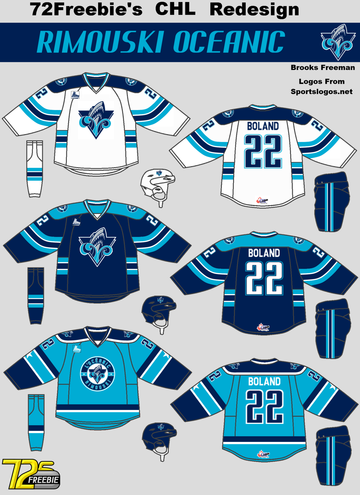 Next up Brooks continues his CHL Redesign with a Rimouski Océanic concept. The curved arm stripes look good, they flow nicely which works well with the waves in their logo. However, I don't like how the side stripes just stop abruptly, they don't flow well. I've got no complaints about the third jersey though, I like the star in the sleeve stripes, I like that it's bright blue, I like everything about it (it would also make a good third jersey for the old Houston Aeros of the WHA).