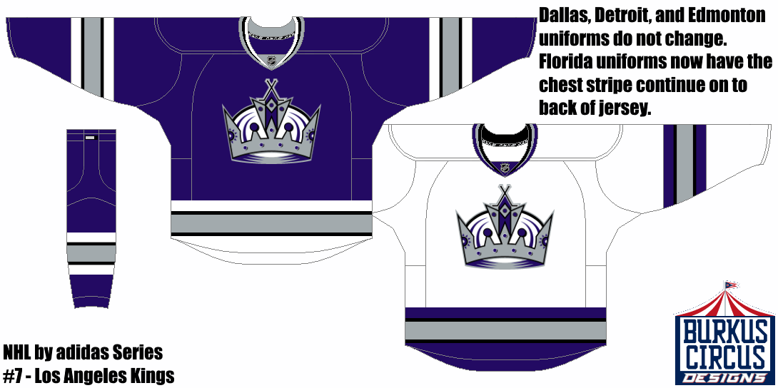 Our second concept from Burkus and our second Kings concept of the day. YES. I love the reintroduction of color to the LA Kings. I think the black and silver worked fine when they could complement the LA Raiders, but should have been left behind when Al Davis moved them back to Oakland. I really like the striping pattern, and the hem stripe works much better than the Los Angeles text that they have used in the past. The inclusion of white in the striping also gives it a better color balance than some of their black and purple uniforms of the past. I think a yoke on the white jersey would have improved color balance, and I probably would have included shoulder patches on both. Same execution errors as above, plus you forgot to put numbers on the arms. Final verdict: a good design, but execution errors hold it back. 7/10